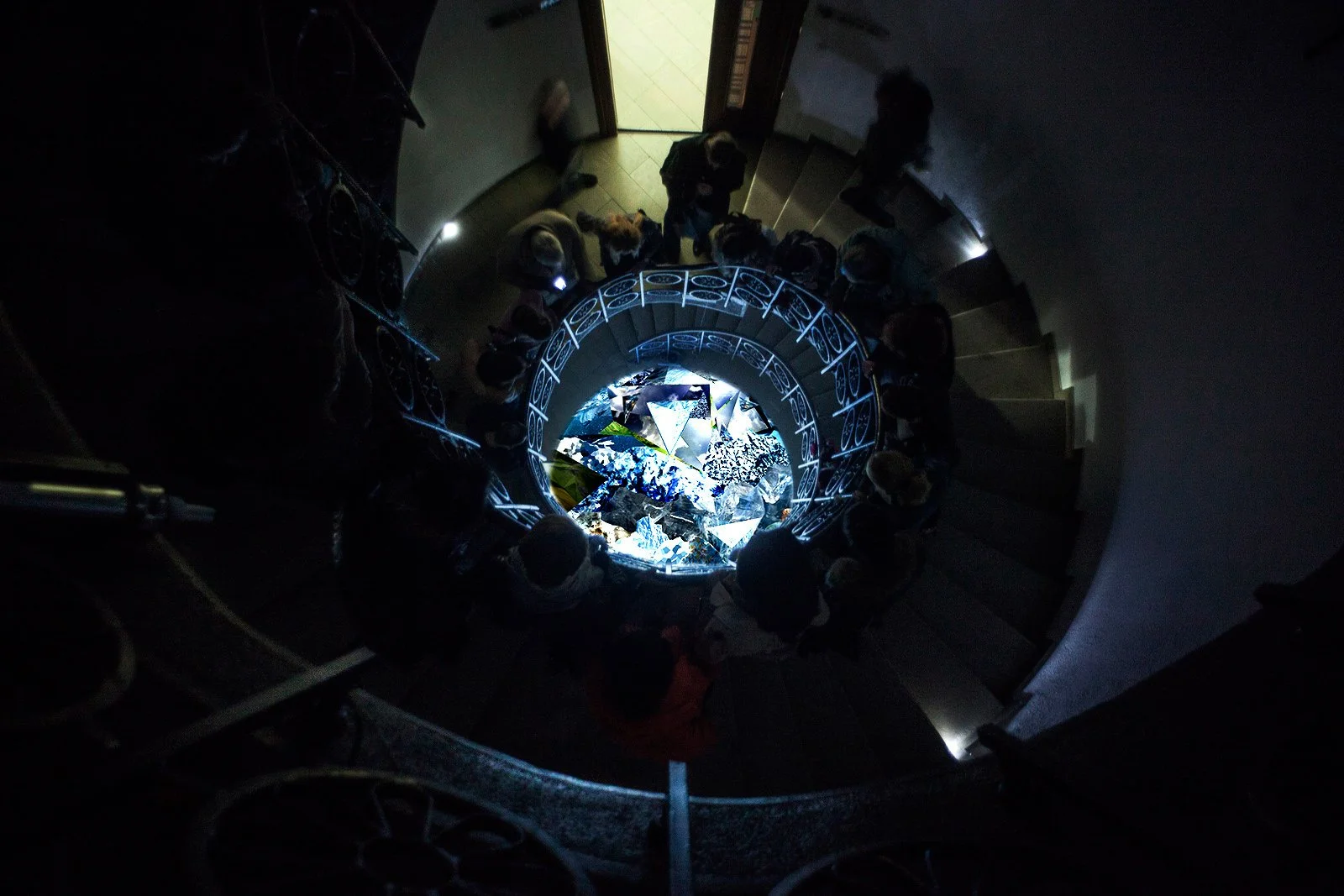The basis of the installation is an immersive one-channel loop video, projected on the floor (base) of the monumental spiral staircase (10 m high) in the form of a circle (3,2 m radius). Video is abandoning its standard shape and frontal orientation and makes coherent unity with the architecture.
