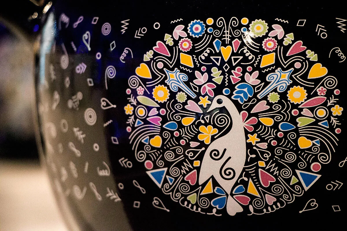 Inspiration for the graphics came from traditional embroidery existing in the region. This type of embroidery is characterized by strong graphical elements usually smaller in size organized on plane background in groups. Round form proved to be the most interesting for a pottery application and at the same time represented a rich and colorful peacock or in the Yugoslav language - Paun.