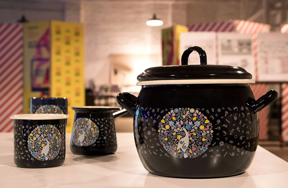 Contemporary redesign for a set of pottery made in enamel. The set of products includes a teapot, coffee pot, small and big mug.